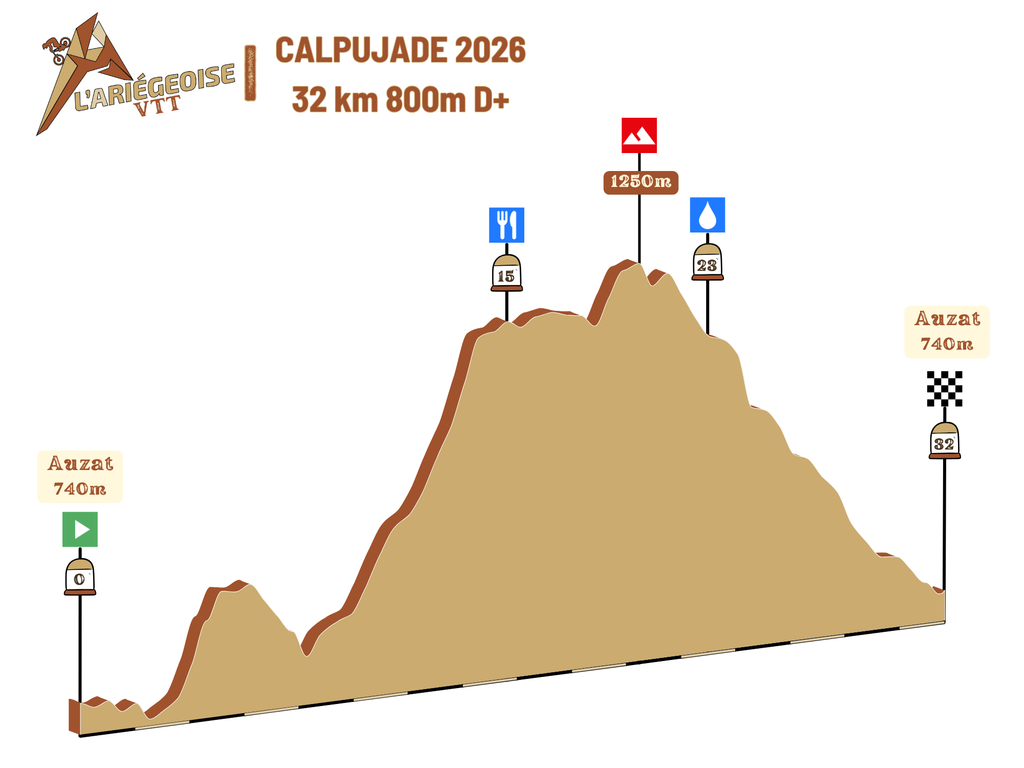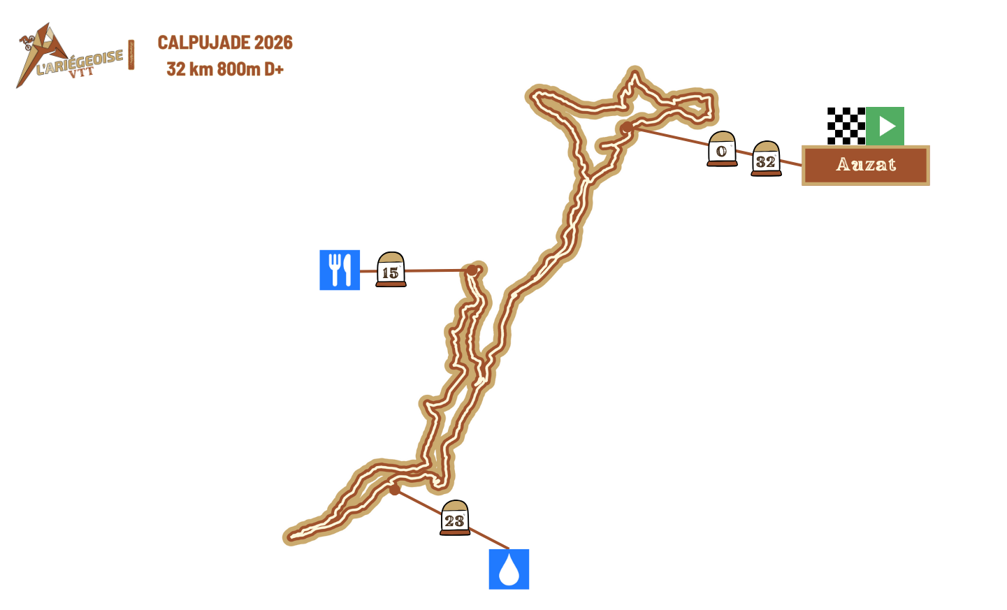 Departure at 8:15 am for a warm-up through the city, followed by a climb to the refreshment stop at 14 km with 450 meters of positive elevation gain. Then, a succession of singletracks will take you from village to village until Ax-Les-Thermes.