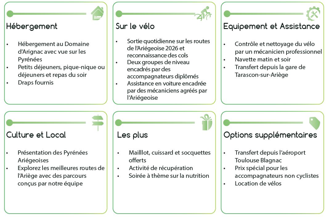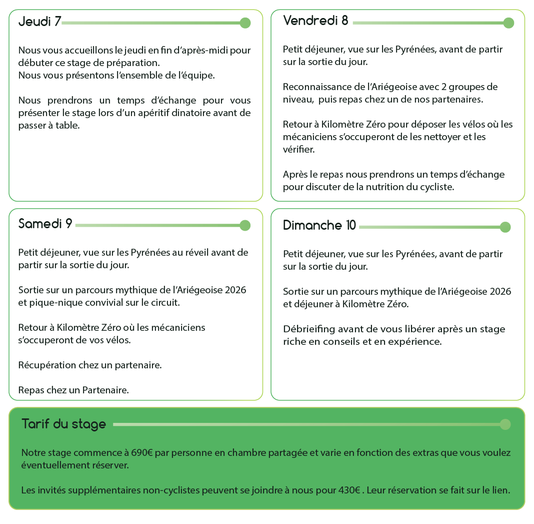 L’arrivée se fera le 7 mai au soir avant trois jours intenses de vélo du 8 au 10 mai, dédiés à la préparation de la célèbre course l’Ariégeoise édition 2026.